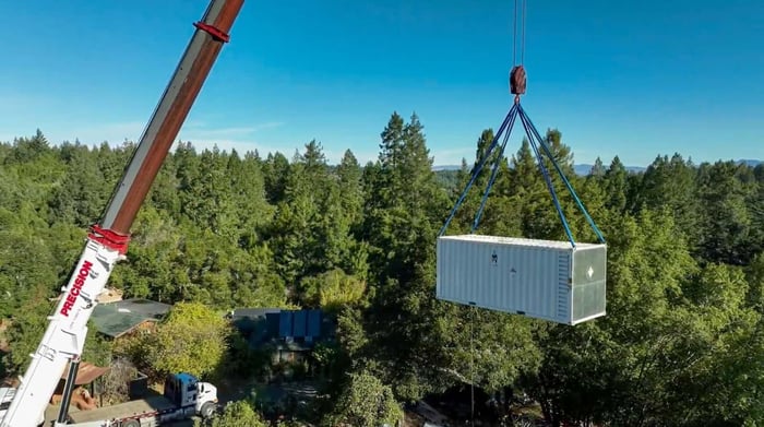 A battery storage system is lowered into place at the 80-acre OAEC farm to ensure power stays on during grid outages (Fall 2024).